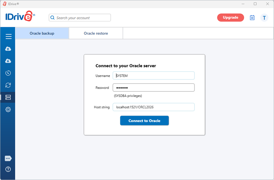 Sign in to the IDrive application and click 'Server Backup'. A slider menu will appear. Select 'Oracle'.