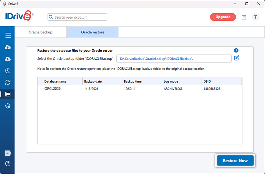 Quick and dependable Oracle database restore ensures business continuity in the event of data loss or system failure. IDrive enables seamless recovery of Oracle databases from your IDrive account.
