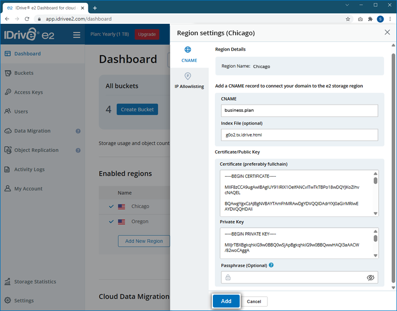 Yes, you can replace IDrive® e2 specific region domain names with your own domain names. You need to create a CNAME record for your domain name server and point that to your e2 region domain name. The Dashboard on the web console lists the IDrive® e2 specific domain names of each enabled region.