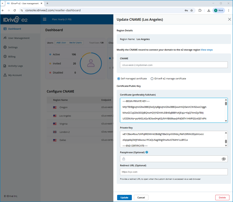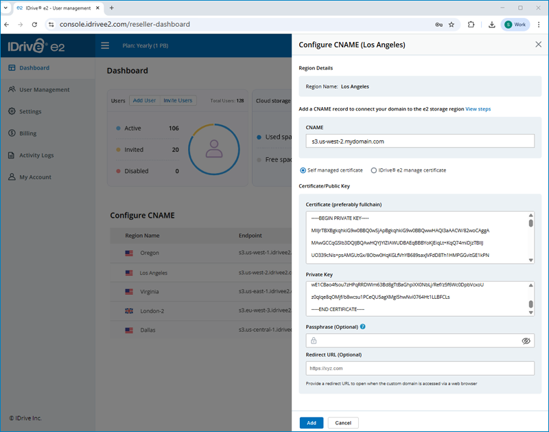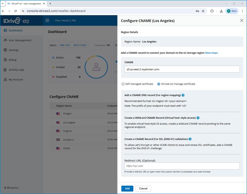 IDrive® e2 allows resellers to create branded regional endpoints for their customers without the need to manually purchase or manage SSL certificates. Using the IDrive® e2 Managed Certificate, resellers can secure custom domains for each region, enabling customers to access their storage buckets through an SSL-protected, branded endpoint instead of the default IDrive® e2 URL.